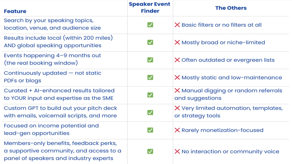 No filler. No fluff. Just speaker-ready opportunities designed to help you get booked and busy consistently.